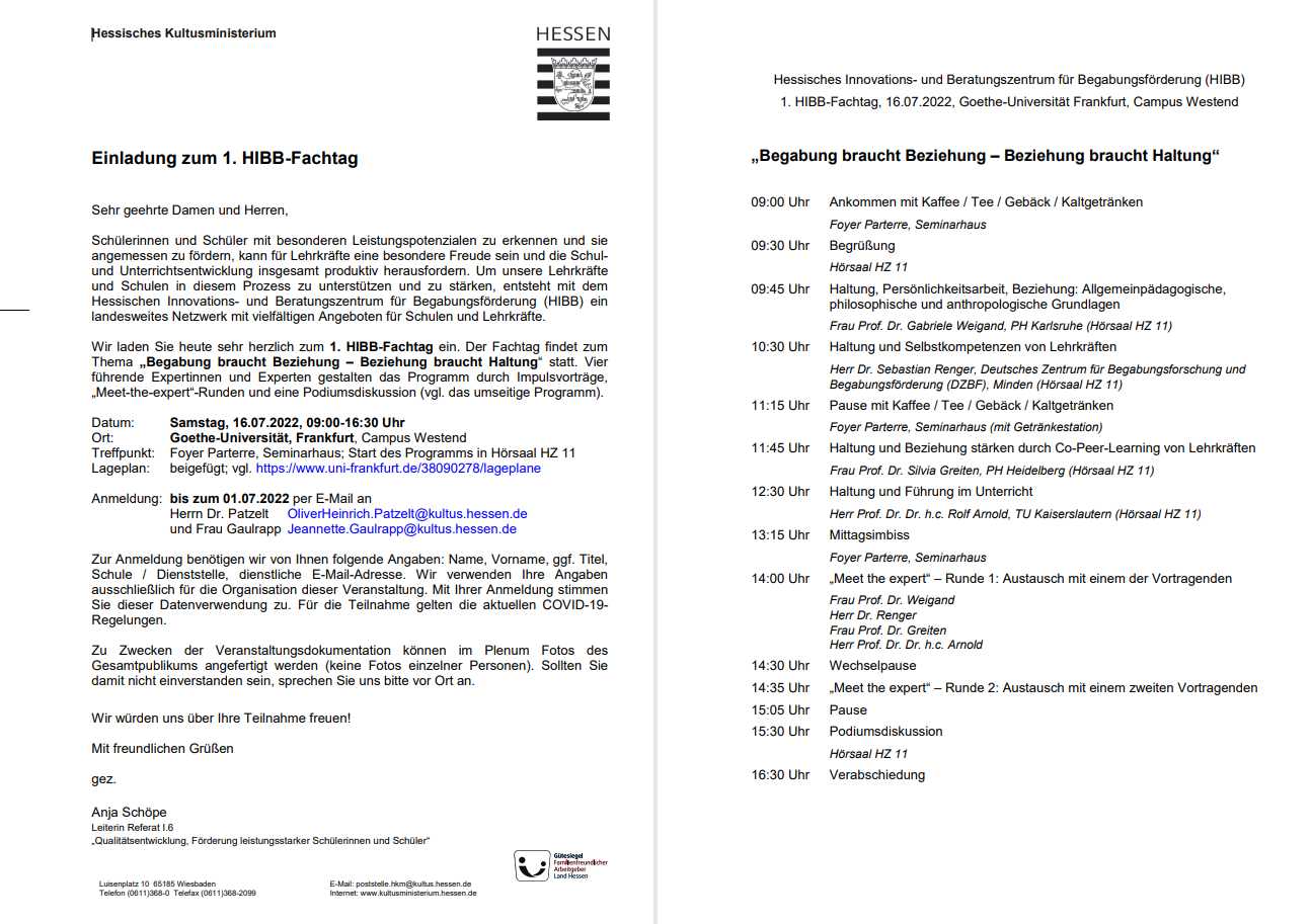 hiermit laden wir Sie sehr herzlich zu unserem 1. HIBB-Fachtag ein. Der Fachtag findet zum Thema „Begabung braucht Beziehung – Beziehung braucht Haltung“ statt. Vier führende Expertinnen und Experten gestalten das Programm durch Impulsvorträge, „Meet-the-expert“-Runden und eine Podiumsdiskussion (vgl. beiliegendes Programm).